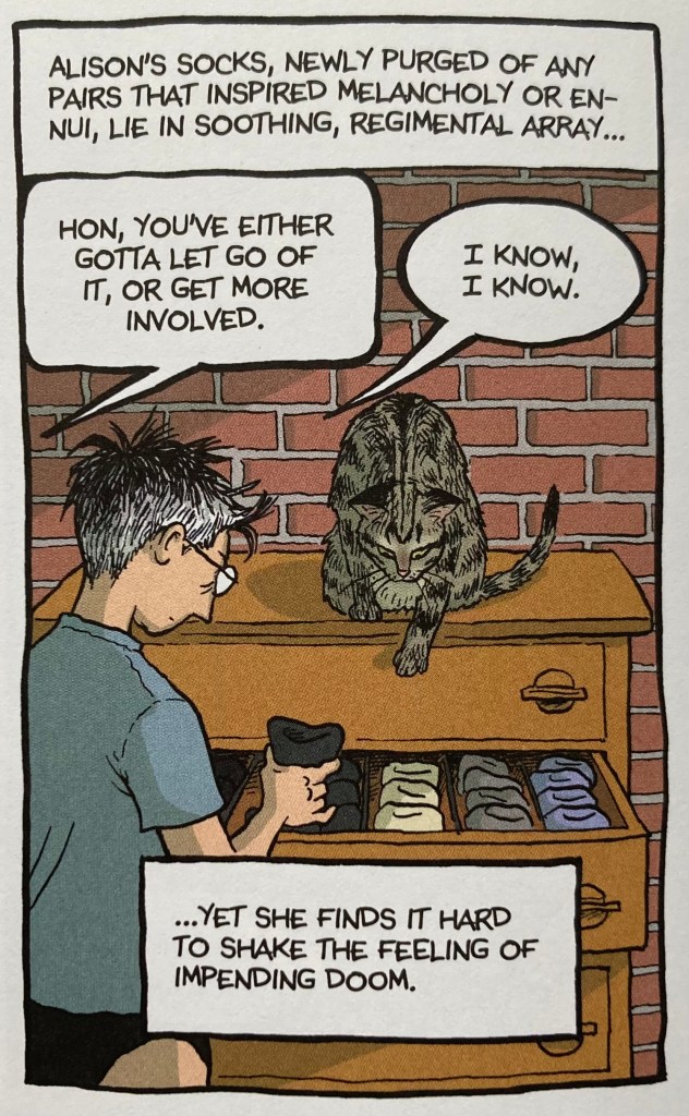 Still, Spent avoids becoming a purely intellectual exercise because of Bechdel’s gift for physical comedy and emotional timing. Her linework, while tight and economical, retains a looseness that makes the characters feel alive even as they monologue. She draws herself with a kind of loving cruelty—baggy-eyed, stoop-shouldered, always teetering on the edge of ridiculousness.
